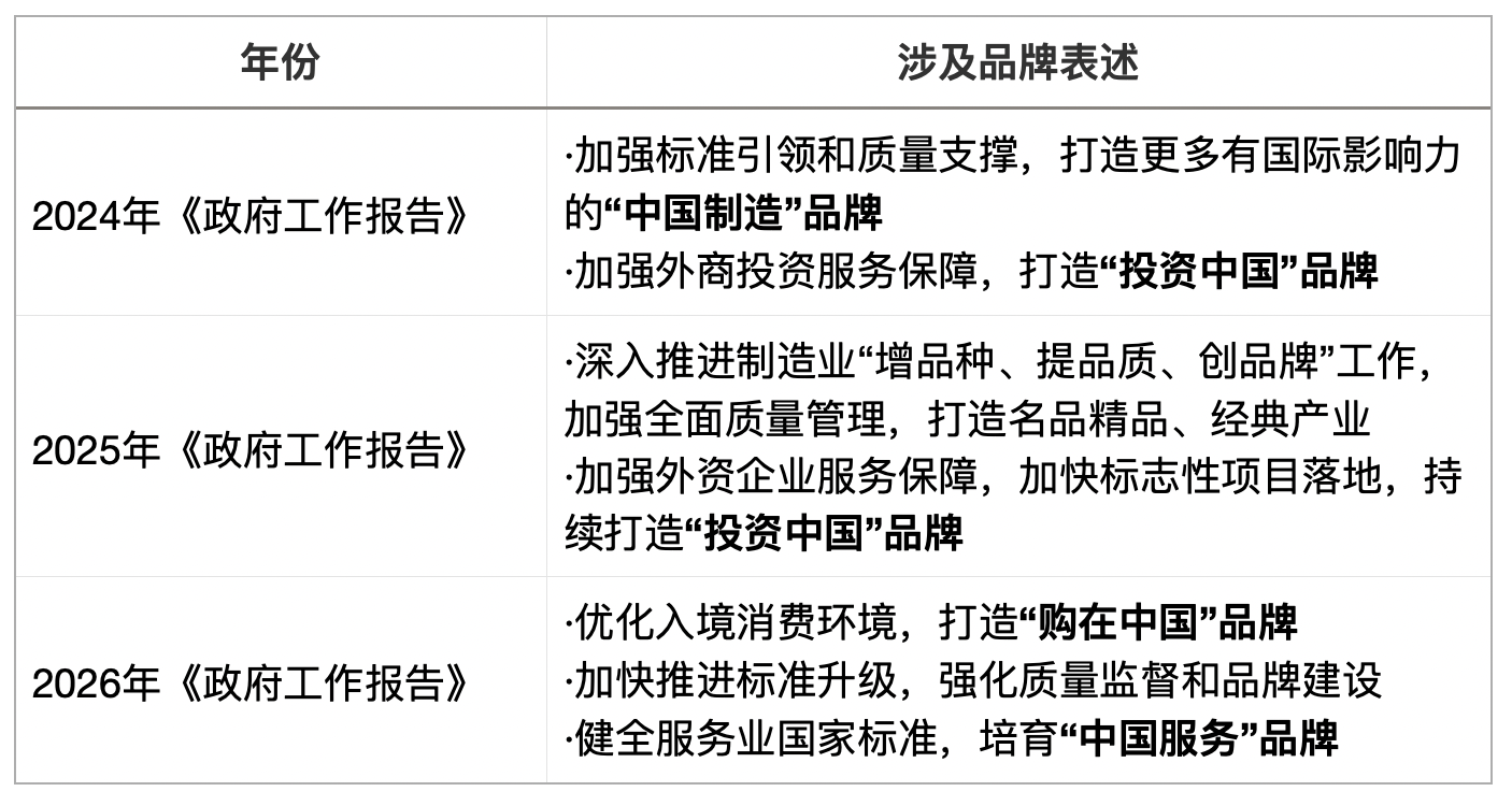值得关注的是,2024年《政府工作报告》提到了“‘中国制造’品牌”,相关表述为“加强标准引领和质量支撑,打造更多有国际影响力的‘中国制造’品牌”。