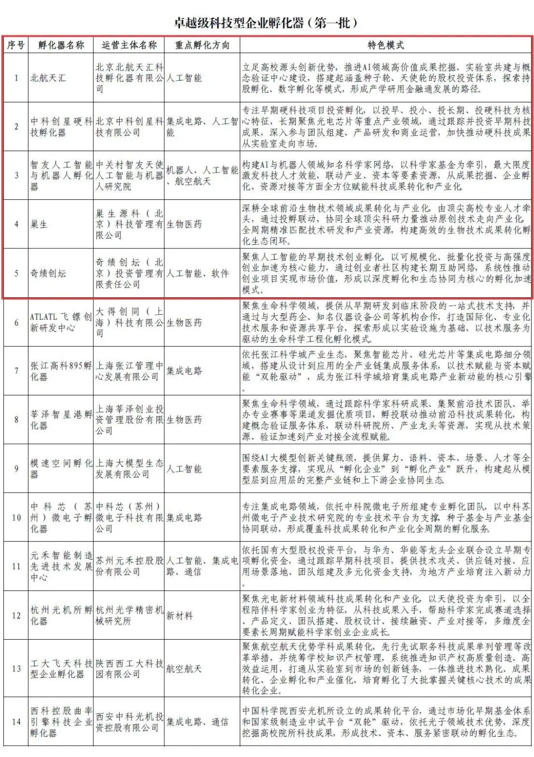 卓越级孵化器:对标国际,打造标杆。首批14家孵化器入选,突出“强产业属性、强服务功能、强人才牵引、强投资赋能、强加速效应”特征,在高校科技成果孵化、前沿技术孵化、投资孵化、产业孵化等方面具有鲜明特色和显著优势,旨在对标国际一流,打造引领科技创新和产业创新融合的标杆载体,为全国孵化器发展提供引领示范。